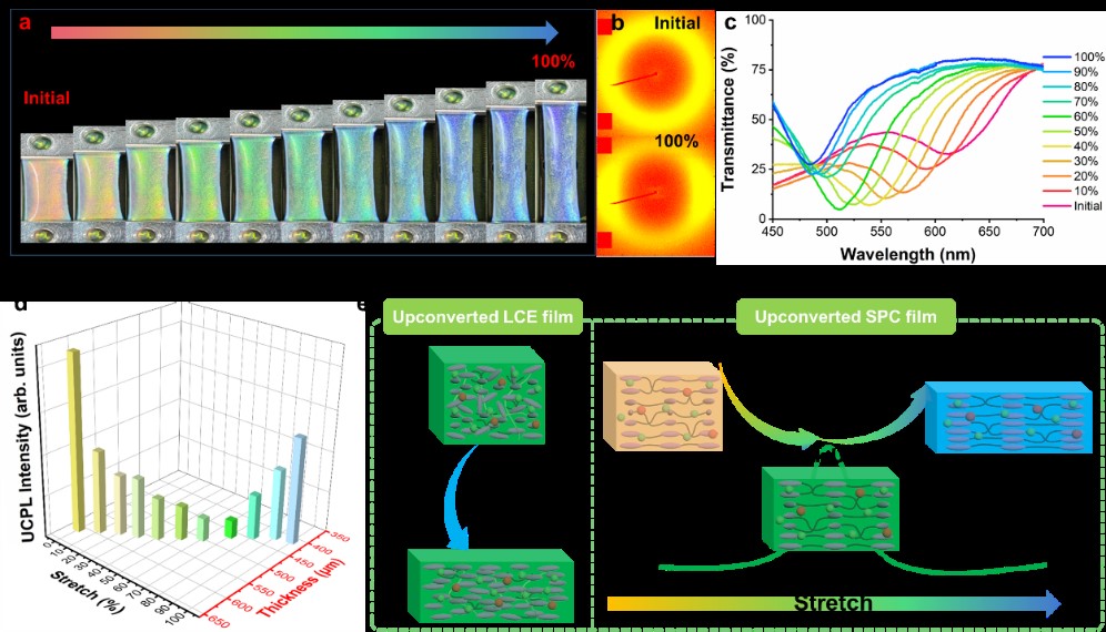 为了探究形变对UCPL性能的影响,我们将一种TTA-UC系统(其中铂(II)四苯基四苯并卟啉(PtTPBP)作为敏化剂,9,10-双(苯乙烯基)蒽(BPEA)作为受体)整合到可拉伸的液晶弹性体(LCE)薄膜中。然而,在纵向拉伸LCE薄膜的过程中,TTA-UC强度出现了逐渐下降的现象。为解决这一难题,基于螺旋型液晶弹性体的可拉伸光子晶体(SPC)薄膜被确定为有前景的载体材料(图一)。SPC薄膜代表了一种新兴的智能材料类别,它将螺旋超结构的独特手性光学特性与弹性体固有的柔韧性和稳定性相结合。需要注意的是,螺旋超结构会产生光子带隙(PBG),这种结构能够在带隙边缘增强发光现象。同时,这些弹性体的延展性使得PBG的带边能够进行调整,以与TTA-UC的发射波段相匹配。这种匹配有望抵消由于变形导致的发射强度下降。此外,SPCs的螺旋排列结构有助于产生圆偏振发光(CPL),其特征是发射出强度不同的左旋和右旋圆偏振光。利用这些独特的特性,将SPCs作为手性模板与TTA-UC组分相结合,有望开发出同时具有可调TTA-UC和上转换圆偏振发光(UC-CPL)特性的材料。