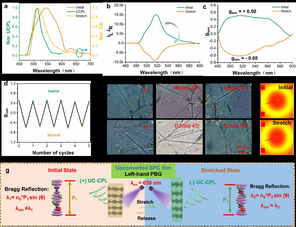 进一步,探讨了机械拉伸对上转换SPC薄膜的UC-CPL性能的动态调控。由于手性光子晶体具有选择性反射圆偏振光的特性,通过圆二色谱证实拉伸可使PBG从545nm蓝移至514nm,从而改变其与UCPL发光峰的重叠程度。测量结果显示,拉伸能使UC-CPL信号从左旋反转为右旋,不对称因子glum从+0.50转变为-0.60。经过5次拉伸-释放循环后glum值保持稳定,表明材料具有良好的疲劳抗性。结构分析表明30%应变下液晶纹理未发生显著变化,证明UC-CPL反转主要源于PBG的位移机制:当PBG与发光峰重合时,体系选择性反射左旋光而透射右旋光,从而输出右旋发光。该研究实现了通过机械力对圆偏振发光的动态调控。(图三)