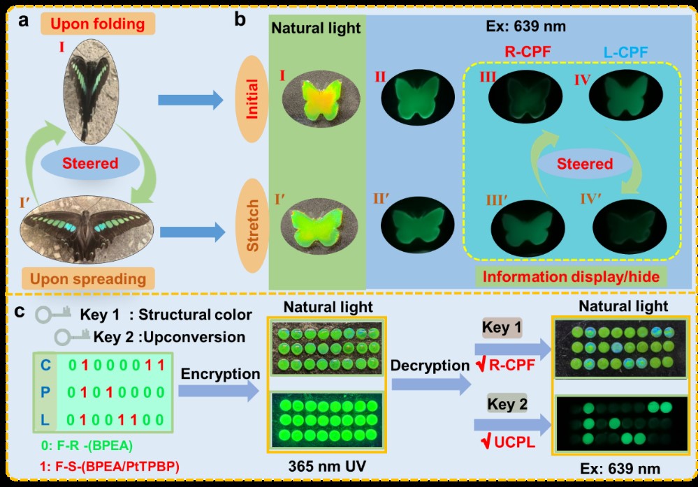 最后基于上转换SPC薄膜的机械可调结构颜色和UC-CPL特性,开发了其在动态信息加密与解密中的应用。受蝴蝶翅膀折叠隐藏、展开显色的启发,制备了蝴蝶形状的上转换SPC薄膜作为信息编码介质。在自然光下,该薄膜呈黄色结构色;在639 nm光激发下,发出绿色UC-CPL,且透过左右旋圆偏振片(R-CPF/L-CPF)呈现显著明暗差异,证实了左旋发光特性。经机械拉伸处理后,薄膜结构色由黄变绿,UC-CPL强度减弱,且圆偏振发光行为发生反转,说明其光学性能可动态调控。进一步地,研究设计了基于结构色与UCPL的二进制信息加密方案:以不同薄膜分别代表“0”和“1”,构成编码矩阵。在自然光或365 nm紫外光下,信息均处于隐藏状态;而通过R-CPF观察结构色变化,或在639 nm激发下识别UCPL发光点,可分别解密出编码信息“CPL”。该策略利用手性光子晶体与上转换发光的独特光学行为,为智能加密材料提供了新思路。(图四)