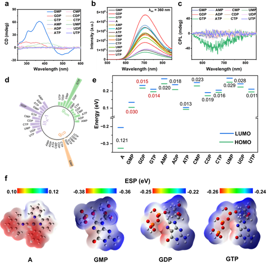 我们通过有机Pt配合物A与三种鸟嘌呤核苷酸(GMP、GDP、GTP)共组装实现对三种分子的多通道光学响应,CD光谱显示GMP可显著增强基态手性诱导,PL光谱揭示GDP的组装能有效提升组装体的发光效率,而CPL光谱显示GTP形成的组装体具有更强的圆偏振发光。DFT计算进一步表明,配合物A与鸟苷核苷酸间的HOMO–LUMO能级匹配以及电荷互补性提供了高效的电子耦合与选择性结合基础,解释了实验中观察到的鸟苷核苷酸特异性光学响应。