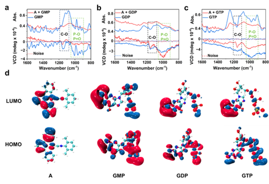 最后通过VCD及分子轨道分析揭示组装体的手性差异。红外吸收光谱显示与C–O和P–O/P=O伸缩振动相关的特征峰,而对应的VCD光谱揭示这些振动区域中手性信号的增强,指明核苷酸与配合物A相互作用中手性源的具体贡献。通过HOMO和LUMO前沿轨道电子云分布进一步分析,不同组分的电子密度及波函数分布显示了分子间相互作用的电子特性,为理解手性诱导组装及选择性识别机制提供了微观电子结构依据。