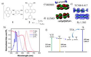 图2. CT共晶和湮灭剂分子结构、电子云分布、吸收发光光谱及CT态敏化TTA过程。