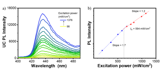 图3. CT态敏化TTA发光光谱及激发强度与发光强度关系。